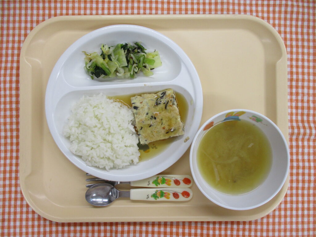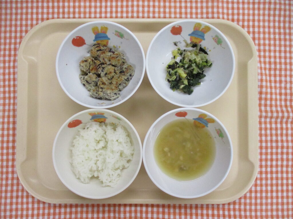 ごはん ひじきのつくねバーグ 磯香和え 椎茸玉ねぎ汁
