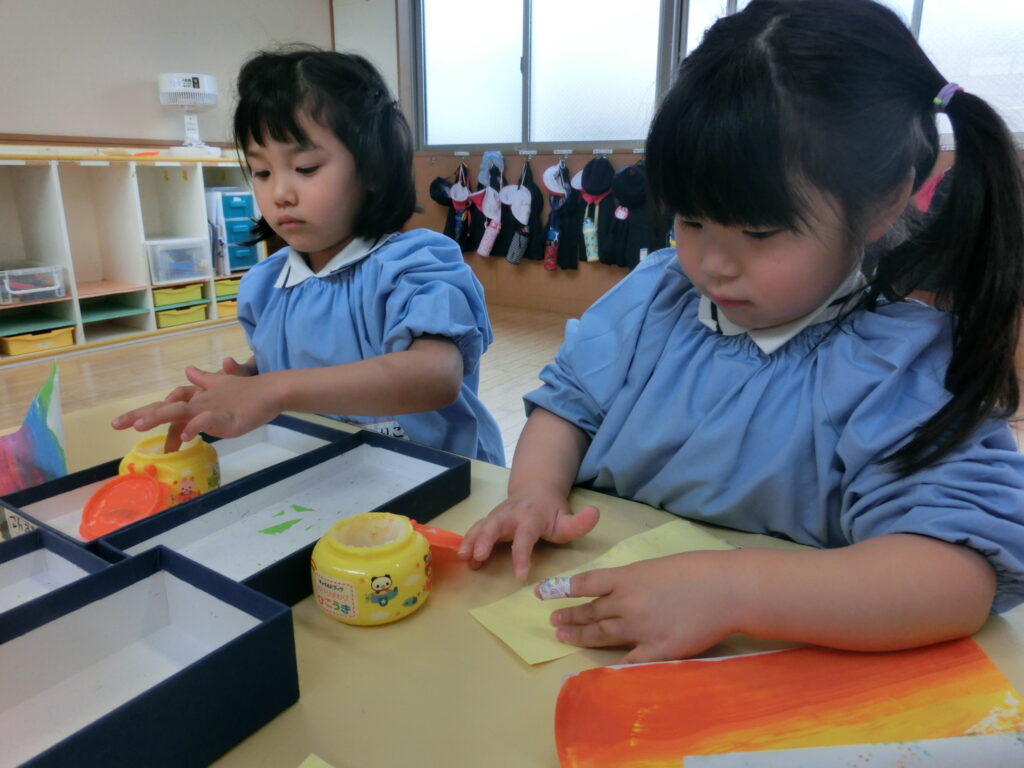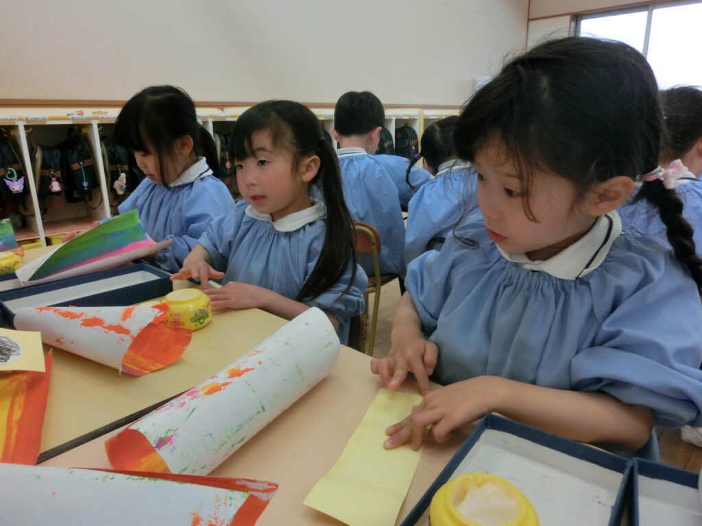 年中組では先日、「こいのぼり」の製作を行いました。年中組では今後、切り絵などを通してはさみの正しい使い方やのりの上手な塗り方などを練習していきます。今回行った「こいのぼり」の製作は保育参観で飾りますので、ぜひ楽しみにしていてください!
