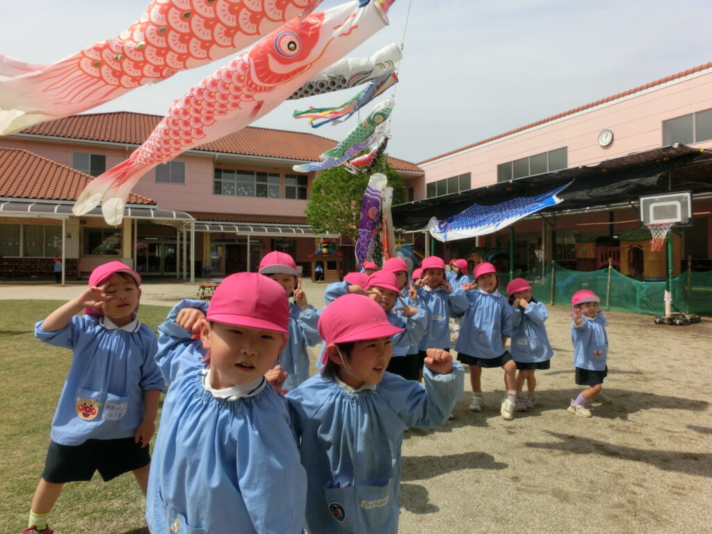 園庭には、たくさんのこいのぼりたちが元気いっぱい泳いでいます。そのこいのぼりたちを見たり触ったりしながら、「きれいだね」「大きいね」などと、楽しそうに話をする子どもたちの姿も見られました。子どもたちの作ったこいのぼりも園庭のこいのぼりのように元気に泳ぎだしそうです。間近で大きなこいのぼりに触れるという経験は、とても貴重なことだと思います。子どもたちもこいのぼりのように元気に成長してほしいです。
