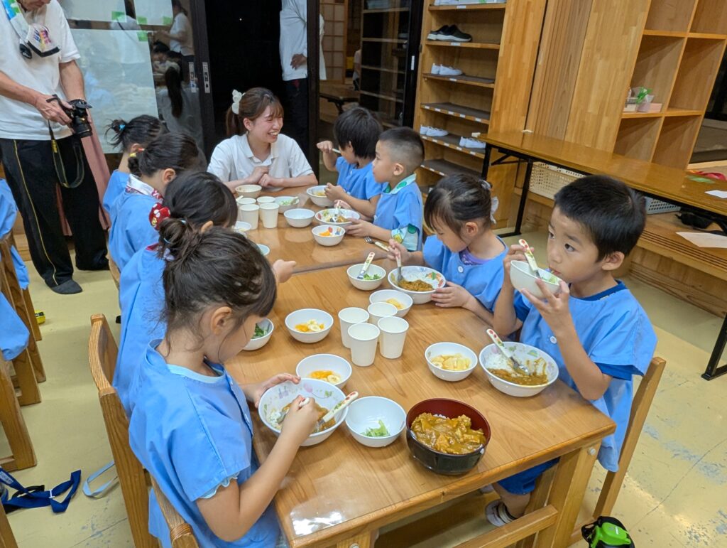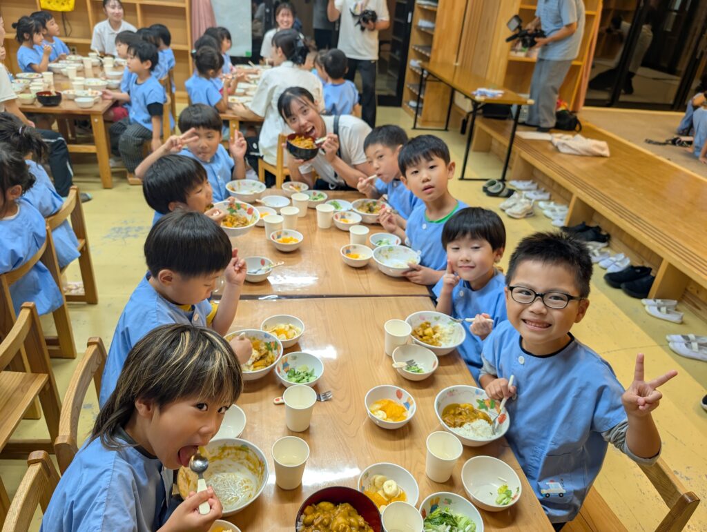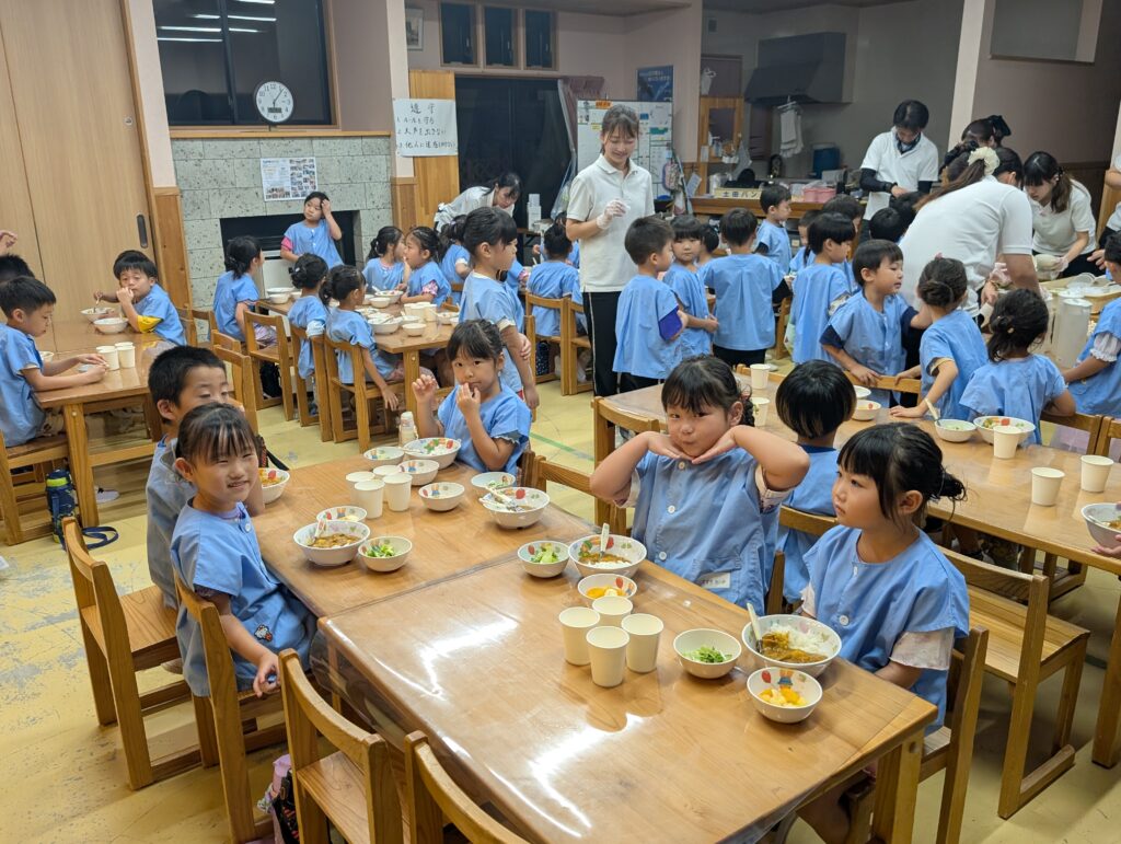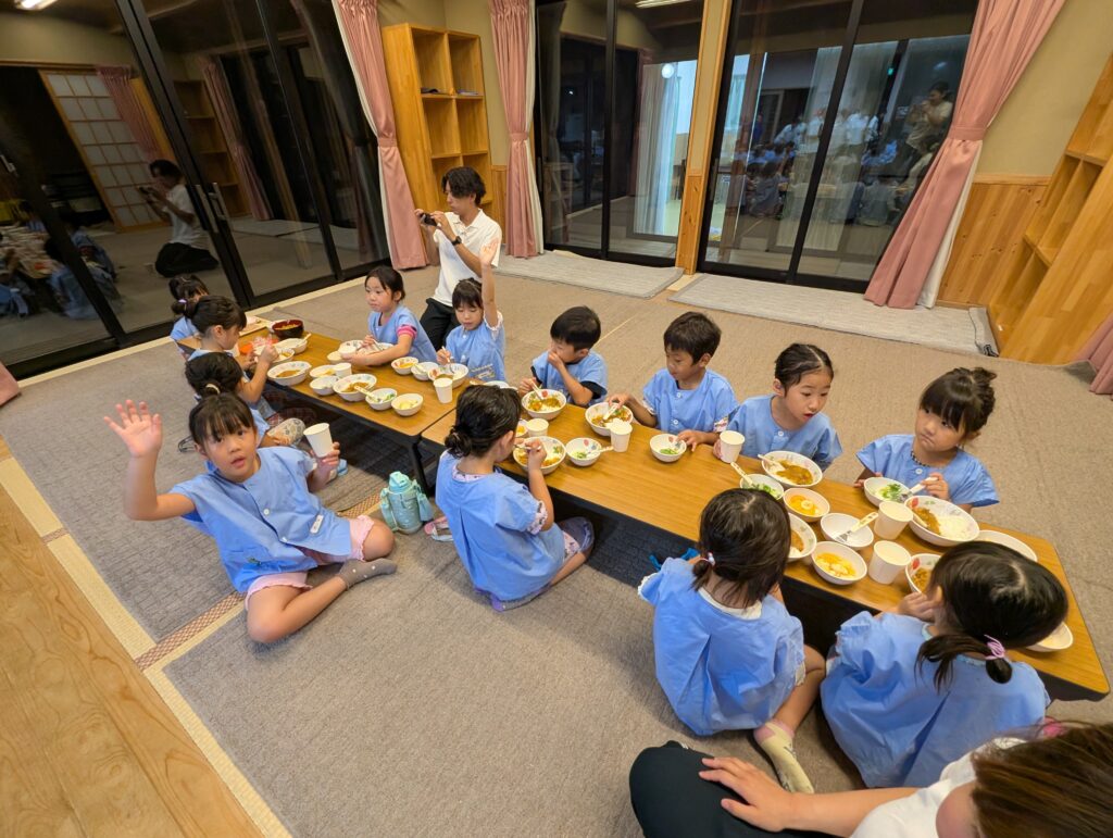 お泊り保育1日目の様子⑤ 2025年9月19日 すみれ日記 お風呂から帰り、夕食タイムです! メニューは、すみれ農園で採れた夏野菜を使ったカレーです◎ みんなおかわりをしながら食べています! 一学期に年長さんが作った梅シロップを梅ジュースにして飲みました! 一覧に戻る