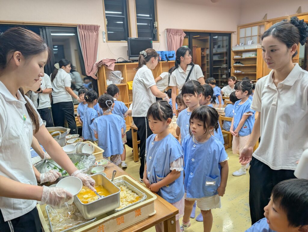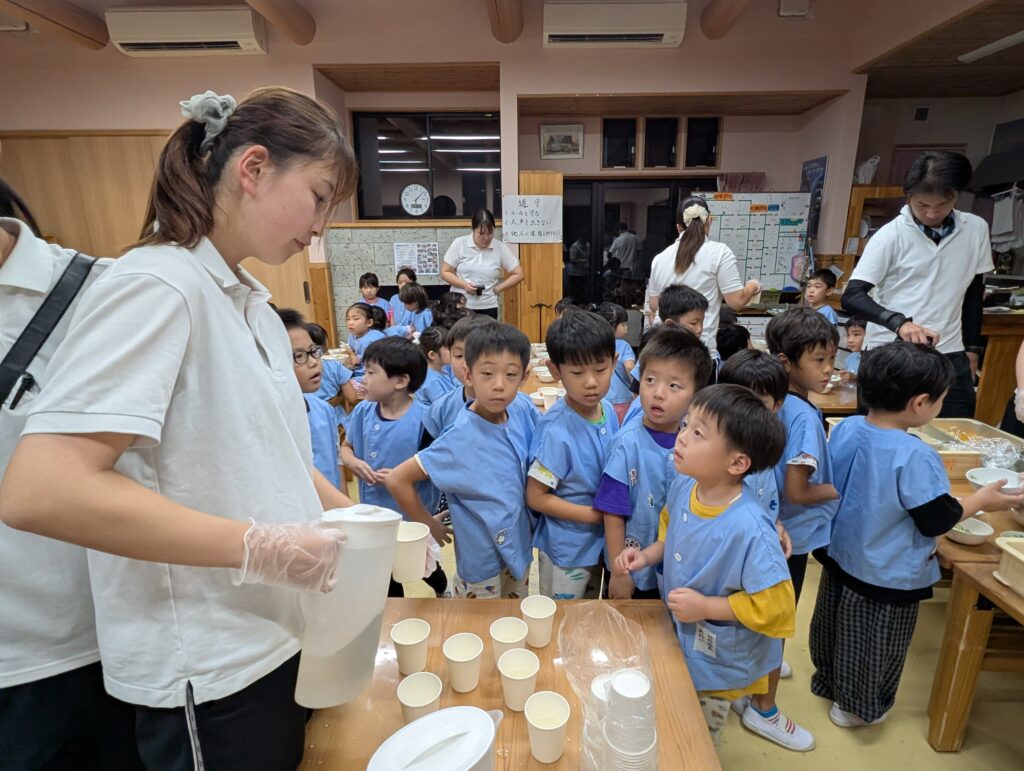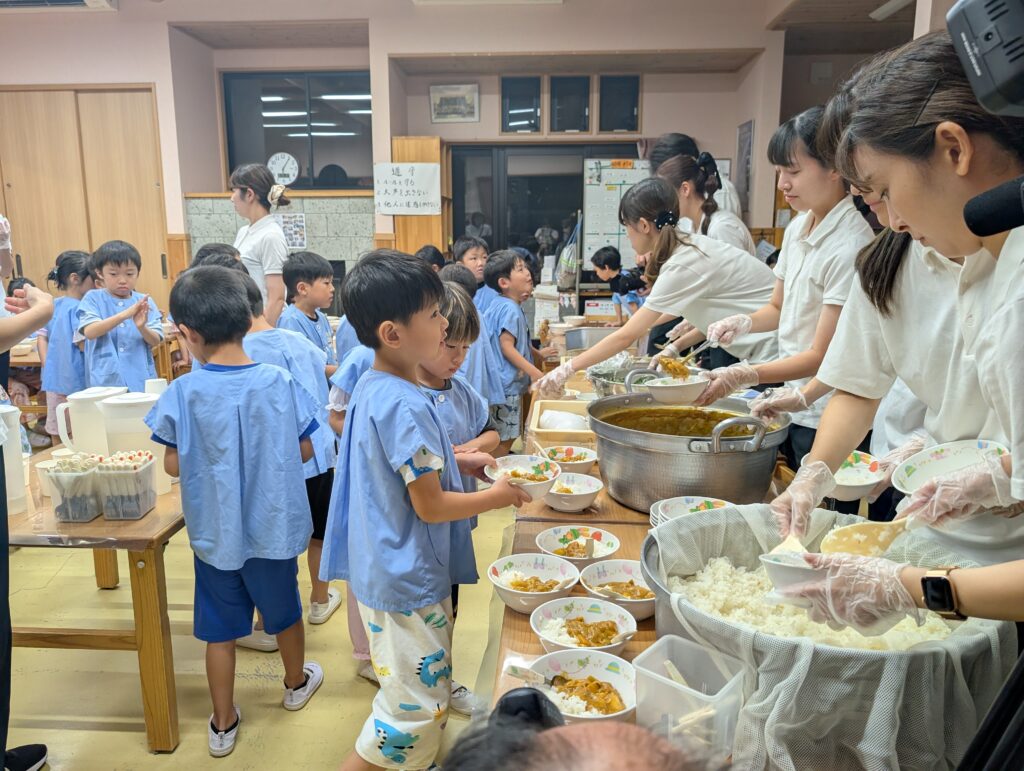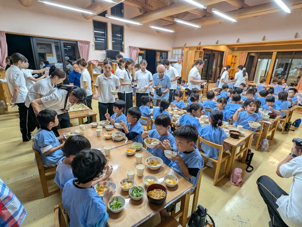 お泊り保育1日目の様子⑤ 2025年9月19日 すみれ日記 お風呂から帰り、夕食タイムです! メニューは、すみれ農園で採れた夏野菜を使ったカレーです◎ みんなおかわりをしながら食べています! 一学期に年長さんが作った梅シロップを梅ジュースにして飲みました! 一覧に戻る