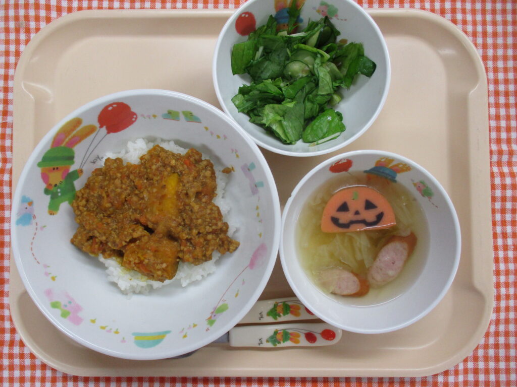 2025年10月31日のおいしい給食 2025年10月31日 おいしい給食すみれ日記 今日の給食 パンプキンキーマカレー 水菜サラダ(オーガニック野菜) ハロウィンスープ 離乳食(中期)おかゆ ひき肉と野菜の煮物 かぼちゃスープ 離乳食(後期・完了)ごはん ひき肉と野菜の煮物 レタスときゅうりのサラダ きゃべつ玉ねぎスープ ぱんだ組のおともだち今日のカロリーは555kcalです。今日はハロウィンの日🎃スープにはかぼちゃの形をしたかわいいかまぼこが入っています。みんなとても喜んでいました!サラダにはオーガニック野菜のレタスと水菜が入っています! 一覧に戻る