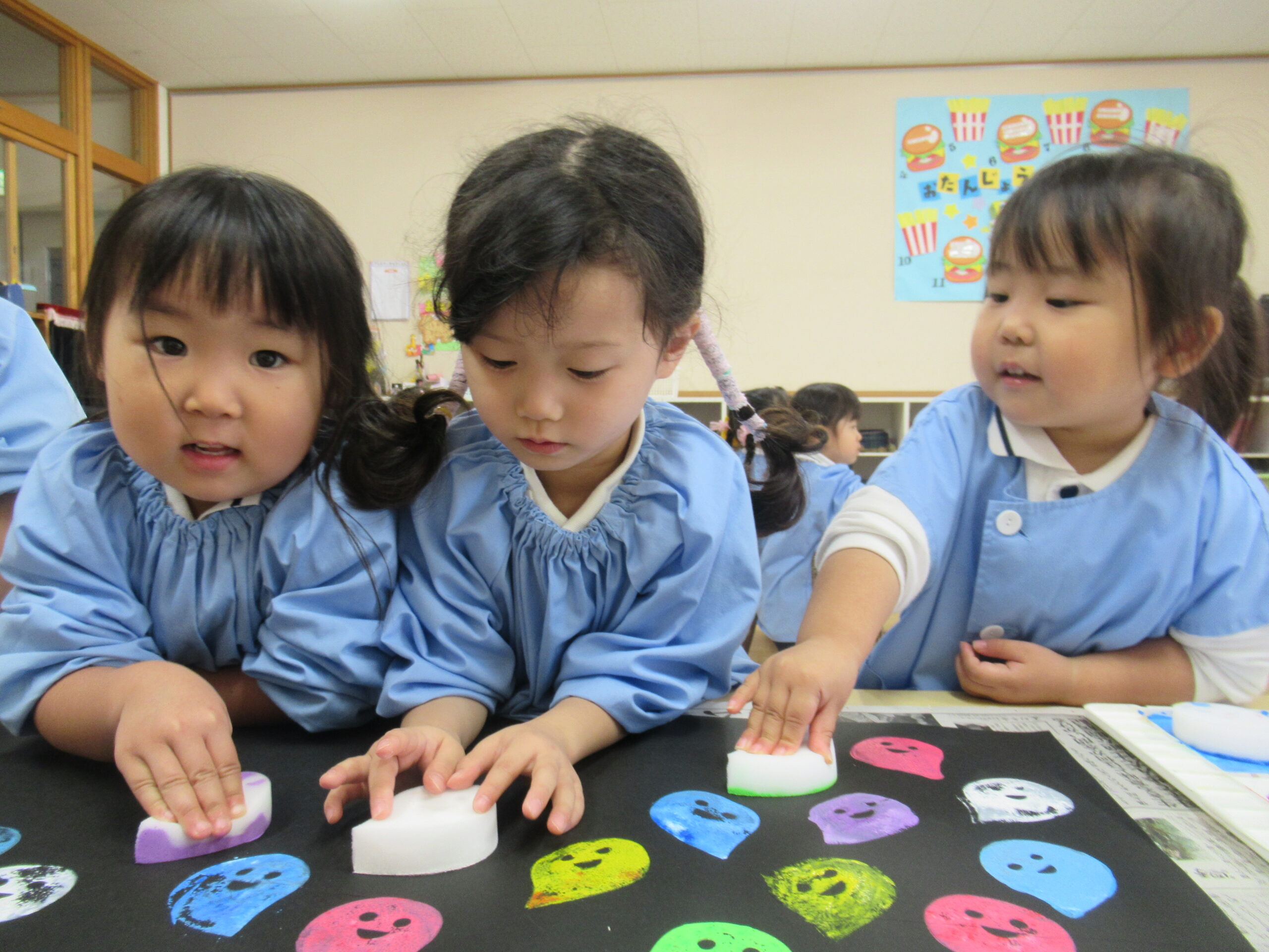 おばけスタンプを使って好きな色でたくさん色付けをしていきます。「このおばけ怖い!」「この子は笑ってるよ!」と、カラフルなおばけを見て盛り上がっていました。他にも、おばけカボチャやキャンディー、おばけのカップも作りました。キャンディーは指先を使ってねじるので少し難しかったですが、何個も作るうちにどんどん上達していきました!
