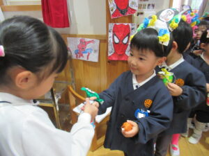 「トリックオアトリート!」とみんなで言うと、「わあ!かわいいね!」「すごい!このキャンディーも作ったの!?」と、他のクラスのお友だちから沢山褒められて嬉しそうなゆり組さん♡頑張って作って良かったね!お友だち同士でも「このキャンディー欲しい」「じゃあこれと交換しよう!」と、楽しんでいました。素敵なハロウィンパーティーになりました。