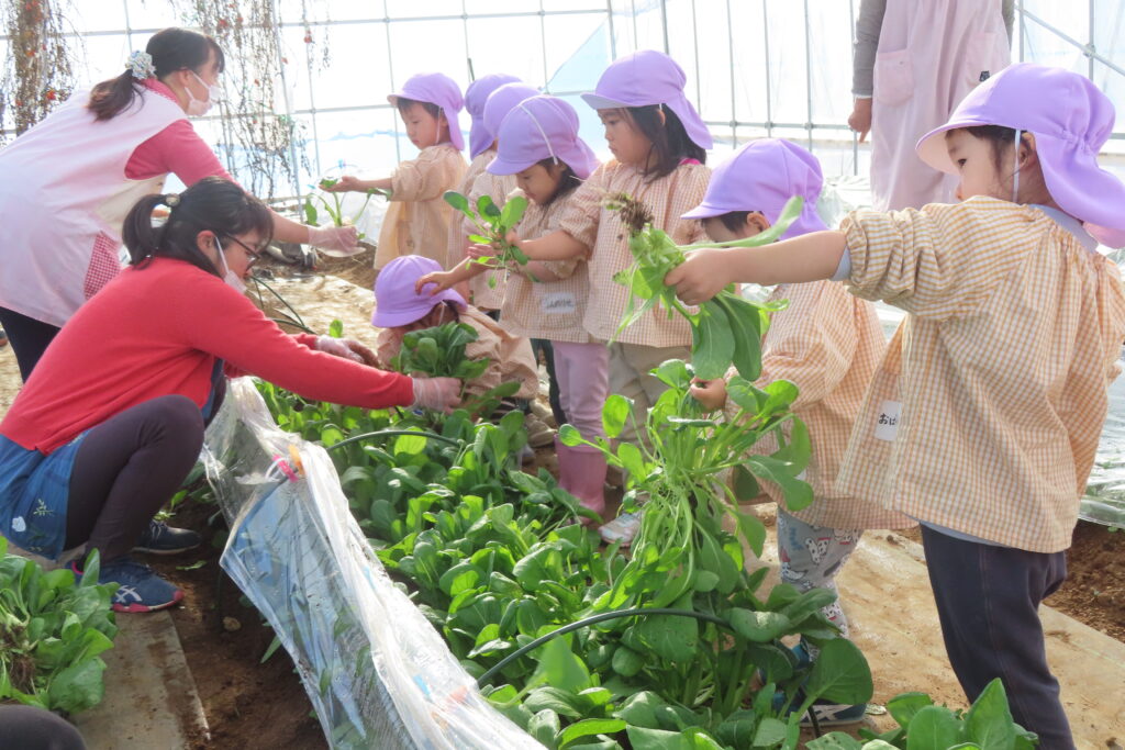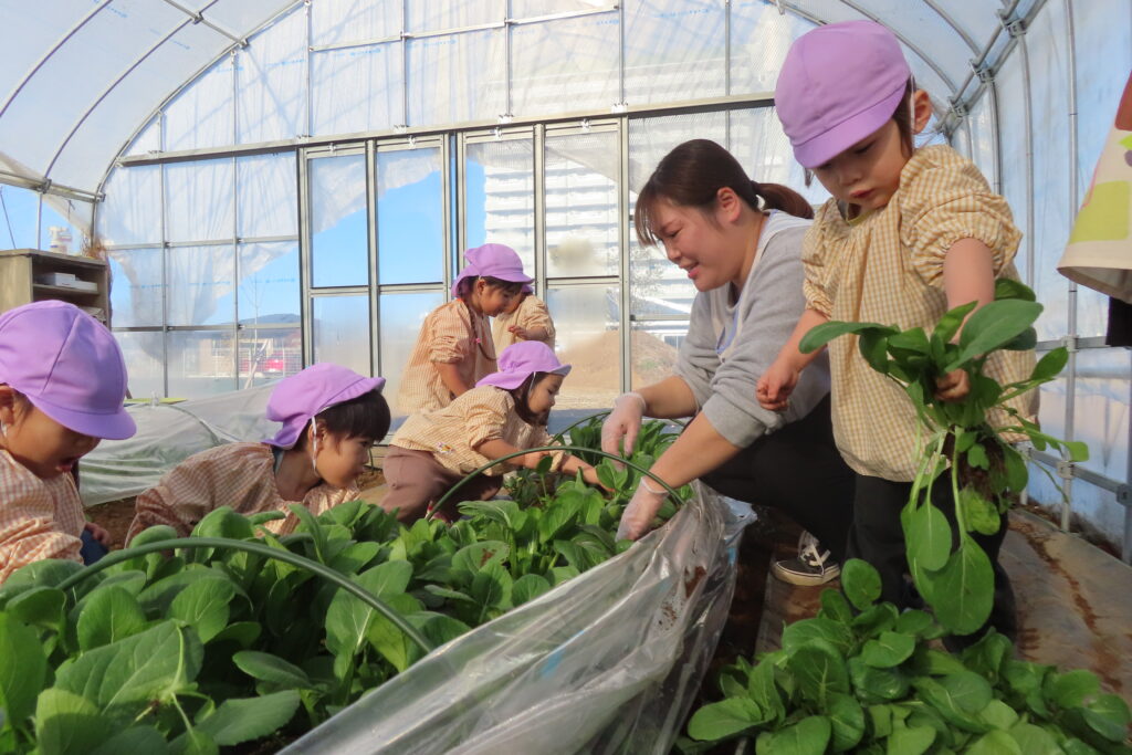 【ときめきフォト】 有機栽培の小松菜収穫 2026年1月14日 2026年1月14日 すみれ日記 2歳児ぱんだ組のお友達が園の敷地内にあるビニールハウスで栽培した小松菜を収穫しました! すみれこども園のビニールハウスでは完全無農薬有機栽培の安心安全な野菜が冬場でも元気に育っています。 ハウスの中に入ると「あったか~い」と外との気温の違いに気づいたお友達もいました。収穫した新鮮な小松菜をみんなで給食室に届けると、さっそく「人参小松菜スープ」をつくりました! いつもは野菜が苦手なお友達も張り切って食べてくれました。 一覧に戻る