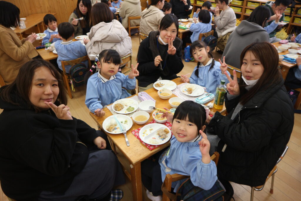 親子給食では、お家の方の隣に座り、ニコニコしながら食べる様子が見られました♪