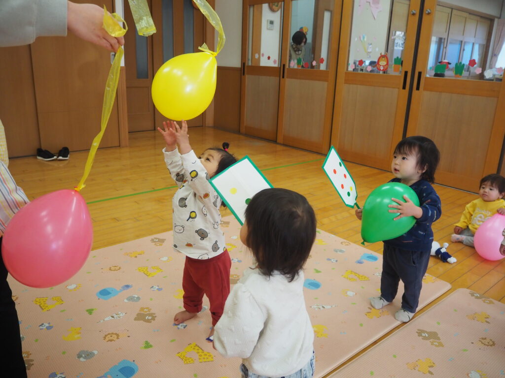 次に羽子板!スズランテープでぶら下げた風船を羽に見立てて保育者と一緒に打とうとしながら楽しみました。風船の動きを目で追ったり、羽子板を振って当てようとしたりしながら、全身を使って遊びました。指先や体を十分に動かしながら、保育者と一緒にお正月ならではの伝統的な遊びを楽しむことができました。