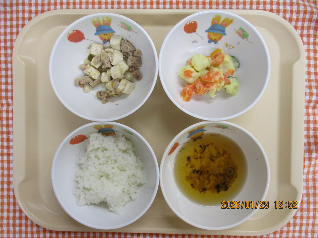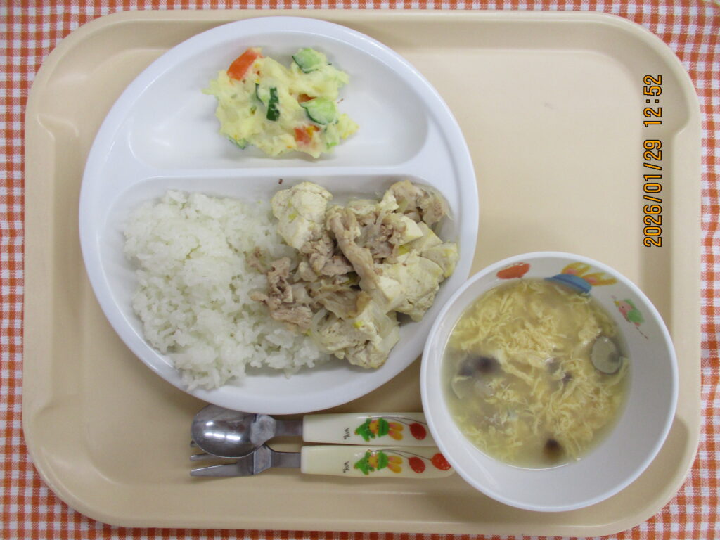 ごはん すき焼き風煮 マセドアンサラダ 卵としめじのスープ