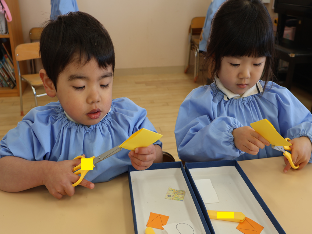 節分製作では、好きな色の画用紙を選んで、カラフルな鬼たちを製作しました。角や眉毛、目や鼻に牙のパーツをハサミで切り、貼りました。ハサミの使い方も少しずつ上手になり、ハサミと画用紙をしっかり持ち、ゆっくり切れました。個性豊かな鬼のお面が完成!「鬼は外~!」と今から節分を楽しみにしている子どもたちです☆