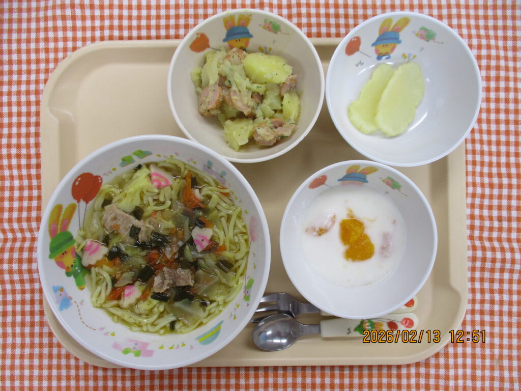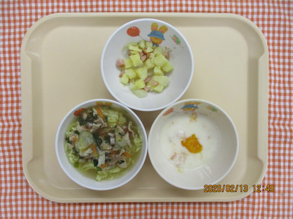 2026年2月13日のおいしい給食 2026年2月13日 おいしい給食すみれ日記 今日の給食野菜タンメンジャーマンポテトみかんヨーグルト⭐給食室と年長さんが作ったたくあんを提供しました!(3~5歳児) 離乳食(完了期)野菜タンメン ジャーマンポテトみかんヨーグルト 今日のおやつ お菓子 ゆり組のおともだち♪今日のカロリー 410kcal 一覧に戻る