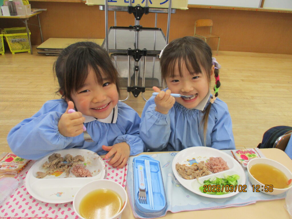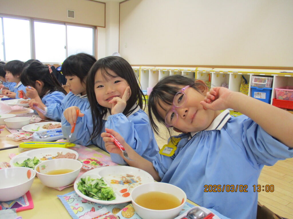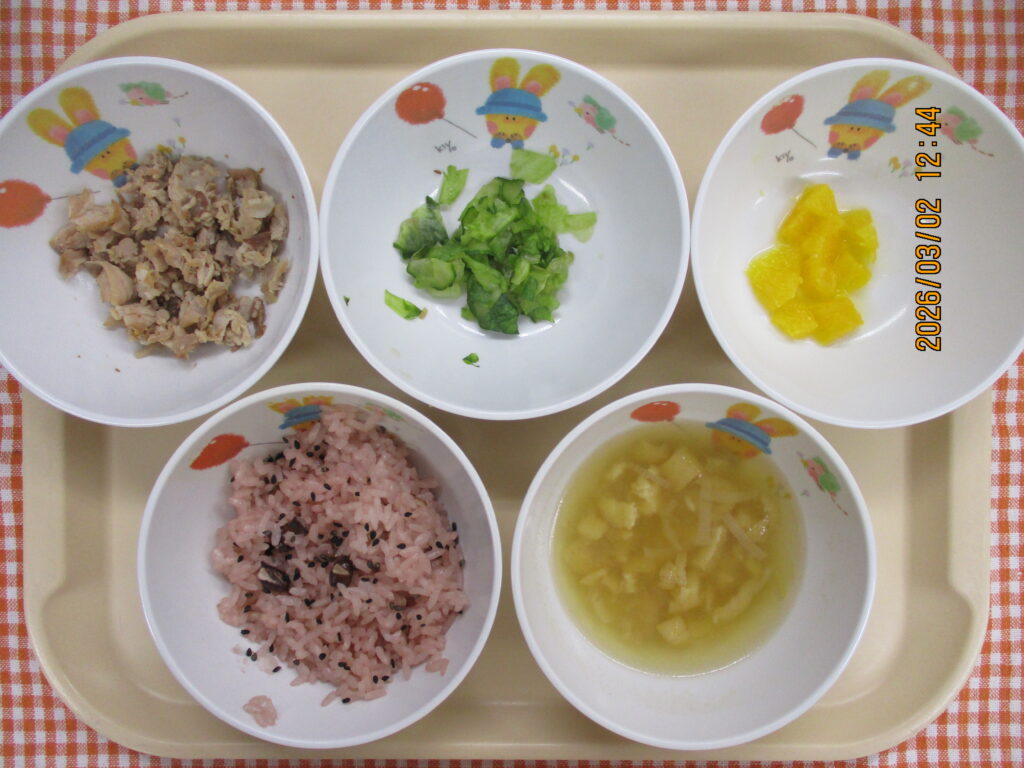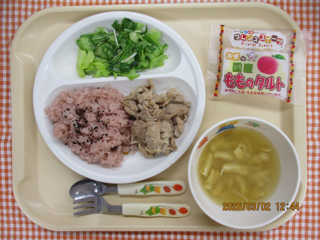 2026年3月2日のおいしい給食 2026年3月2日 おいしい給食すみれ日記 今日の給食お赤飯(1~2歳児=あずきご飯) 焼肉 水菜サラダ ねぎ油揚げ汁 国産もものタルト(1~2歳児=オレンジ) 離乳食(完了期)あずきご飯 焼肉 レタスときゅうりのサラダ ねぎ油揚げ汁 オレンジ 今日のおやつチーズ蒸しパン きく組のおともだち今日のカロリーは、511kcalです。「いつもごはんつくってくれてありがとう」と言うおともだちがいました😊 一覧に戻る