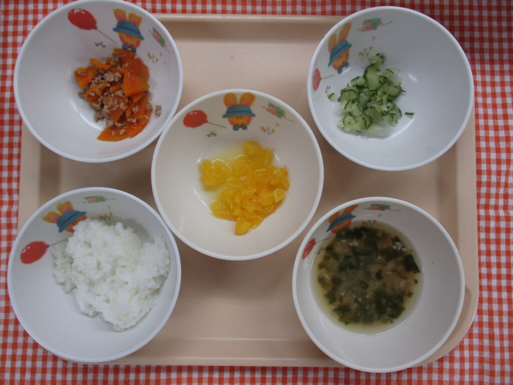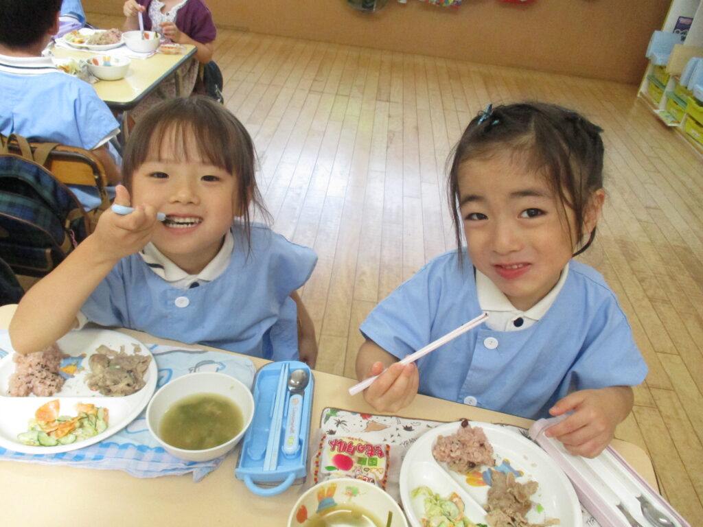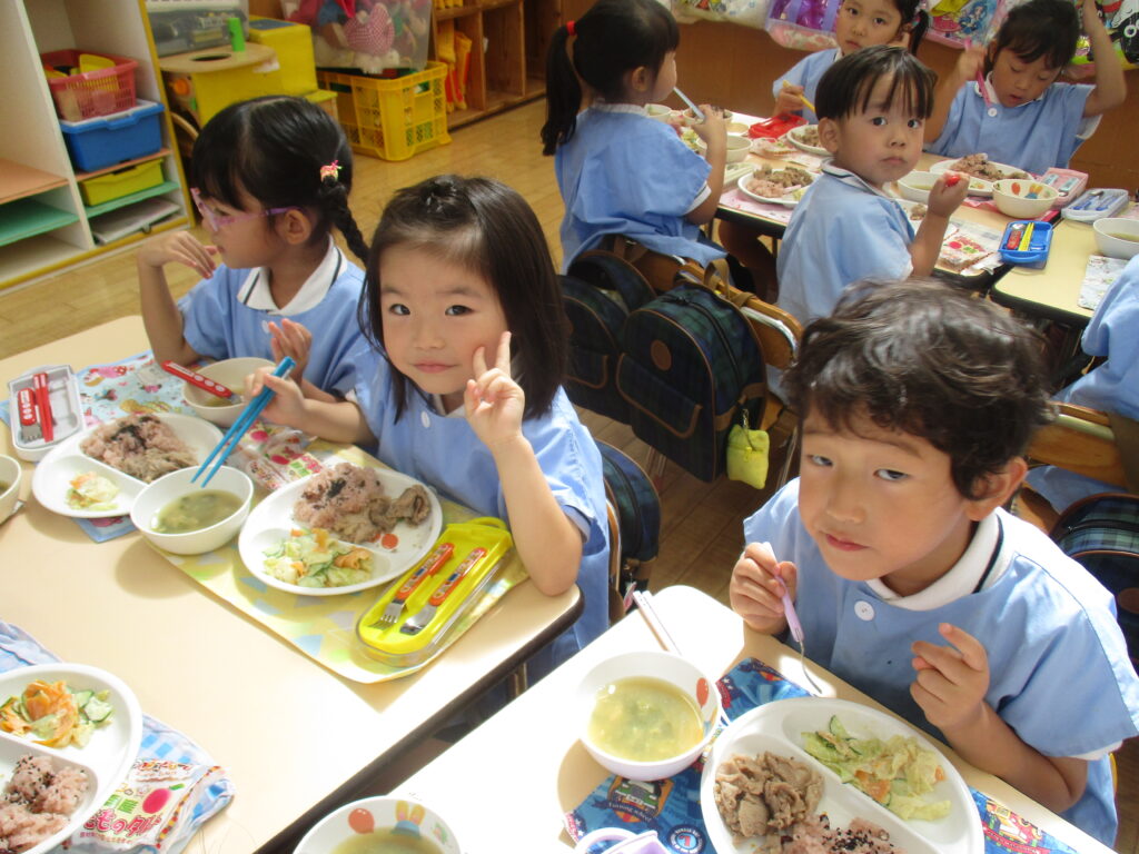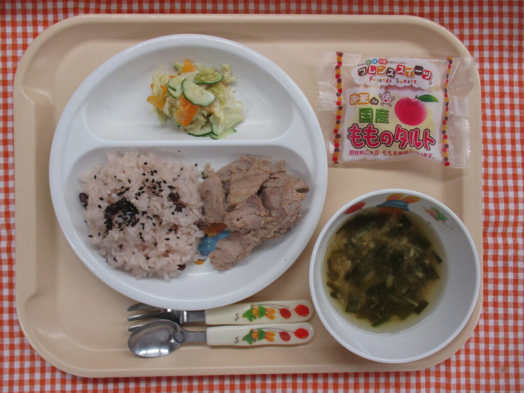 2025年9月17日のおいしい給食 2025年9月17日 おいしい給食 今日の給食お赤飯(1・2歳児=あずきご飯) 焼肉 きゃべつのごまネーズ和え にらえのき汁 国産もものタルト(1・2歳児=オレンジ) 離乳食(初期)おかゆ にんじんペースト 離乳食(中期)おかゆ ツナきゃべつ煮 にんじんスープ 離乳食(後期・完了)ごはん 豚肉とにんじんの煮物 きゃべつときゅうりのごま和え にらえのき汁 オレンジ きく組のおともだち今日のカロリーは、535kcalです。「せんせいおいしい!」「おかわりするの!」と元気よく話しかけてきたおともだち😊 一覧に戻る