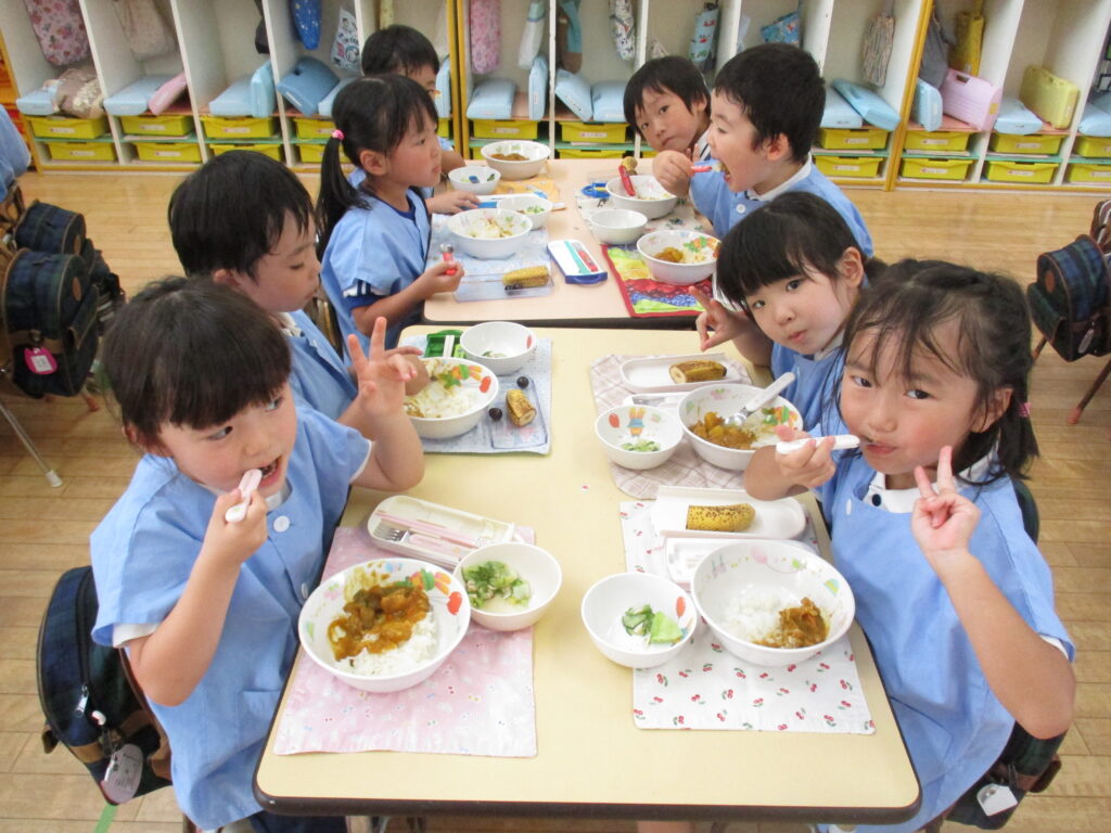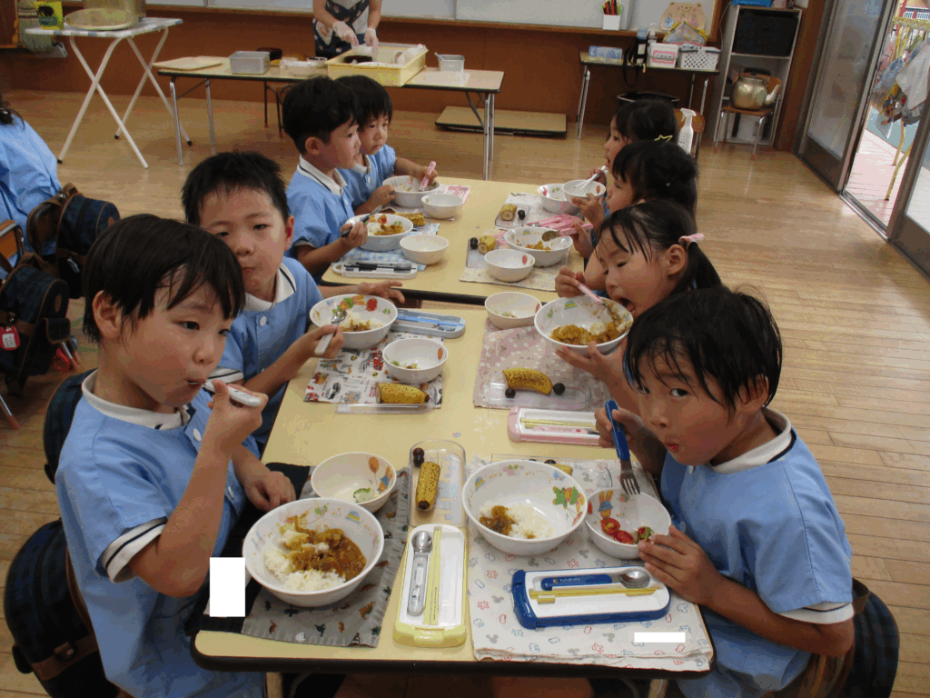 今日のカレーには、おひさま組・ひよこ組・こあら組・ぱんだ組・年長組がすみれ農園で収穫したなす・ピーマン・かぼちゃが入っています!