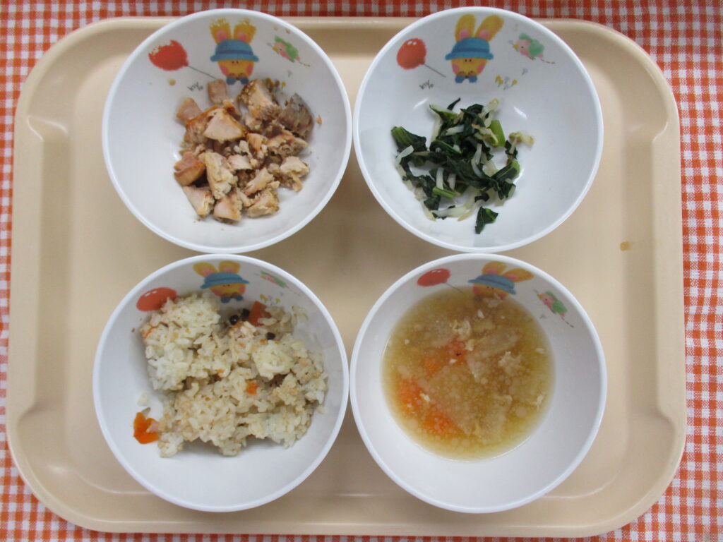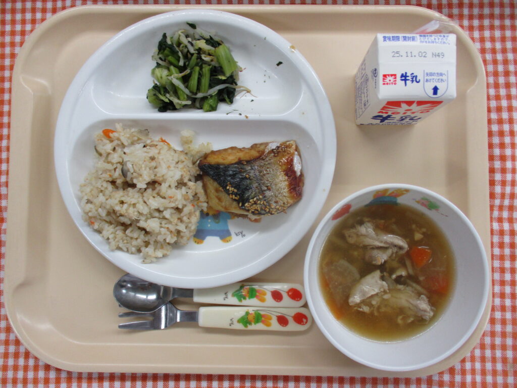 きのこごはん さばのごま焼き 磯香和え 豚汁 牛乳(3~5歳児)