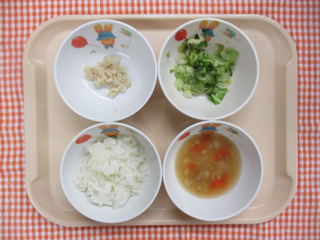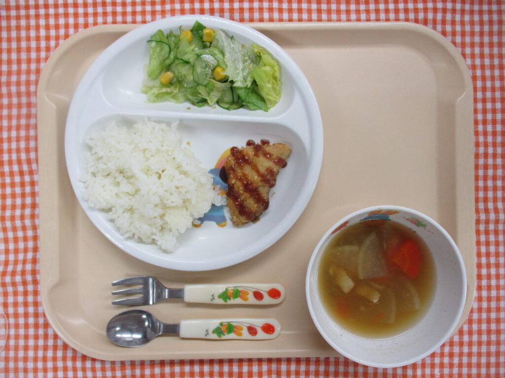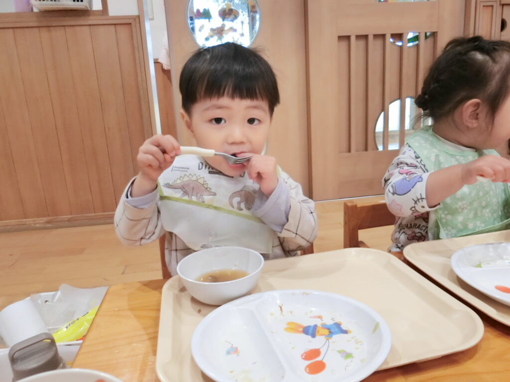 野菜がたくさん入った根菜汁をパクパク食べています😊久しぶりのたらのフライもフォークで上手に食べていました!