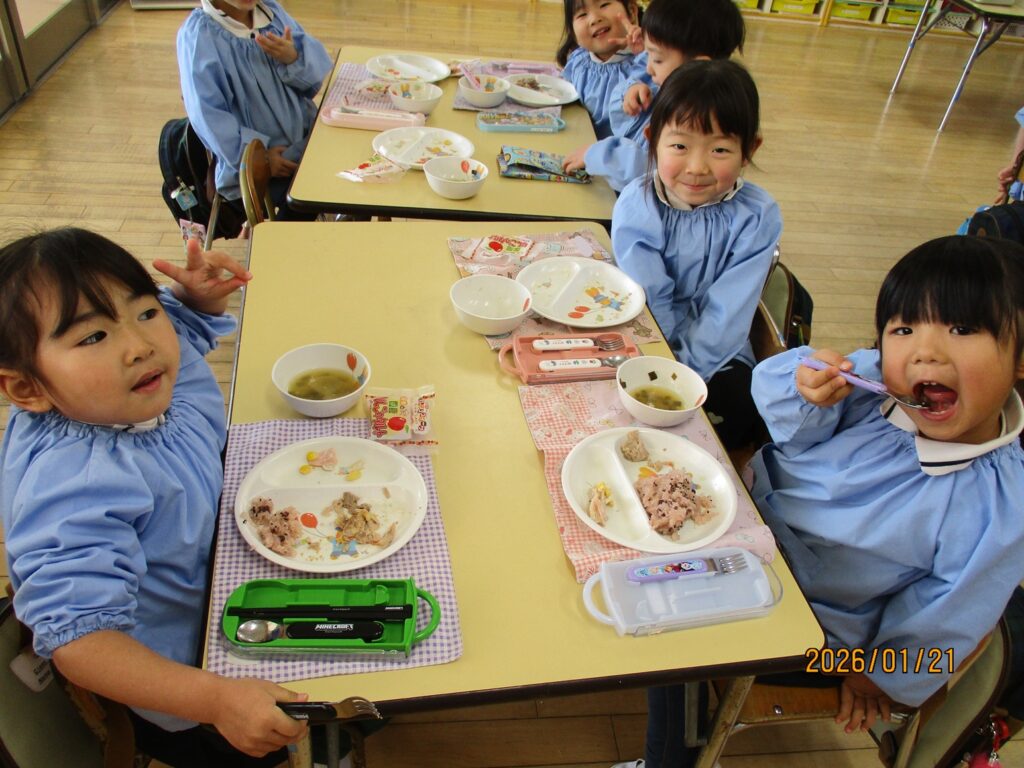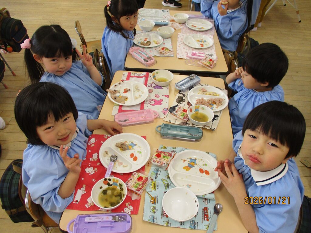 今日は、年少のおともだちが収穫してくれた大根をみそ汁に入れて提供しました😊