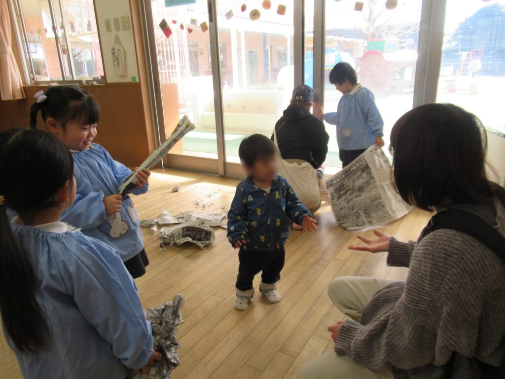 今回は、3歳児クラスのお友だちと交流会を行いました。朝の会をして歌を歌ったり、新聞紙遊びをしたりしました。朝の会では、一緒に音楽に合わせて、体を動かして楽しむ姿がみられました。新聞紙遊びでは、新聞紙をちぎったり丸めたりして様々な物を作り、小さいお友だちに最後はみんなで見せたり、新聞紙の雨をみんなで降らせたりし、楽しい時間を過ごしました。