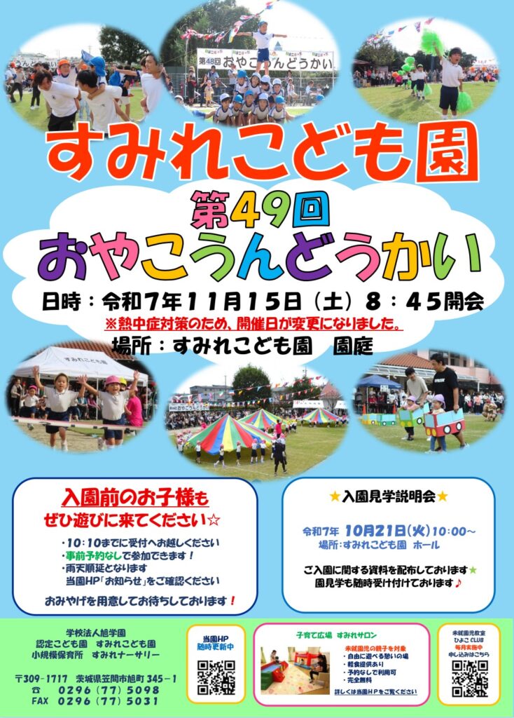 【未就園児の皆様へ】運動会のご案内 2025.10.17 すみれこども園「第49回おやこうんどうかい」を開催いたします。未就園児のお友達の競技もありますので、ぜひお越しください。 【日にち】令和7年11月15日(土)【時 間】8:45開会 ・未就園児の皆様は10:10までに受付を済ませてください。・予約なしで参加できます。 【場 所】すみれこども園 園庭【駐車場】すみれこども園 第2駐車場 【その他】・雨天時は翌日11月16日(日)に順延 延期の場合はHPでお知らせいたします。 運動会 チラシ –ダウンロード すみれこども園リーフレットダウンロード 一覧に戻る